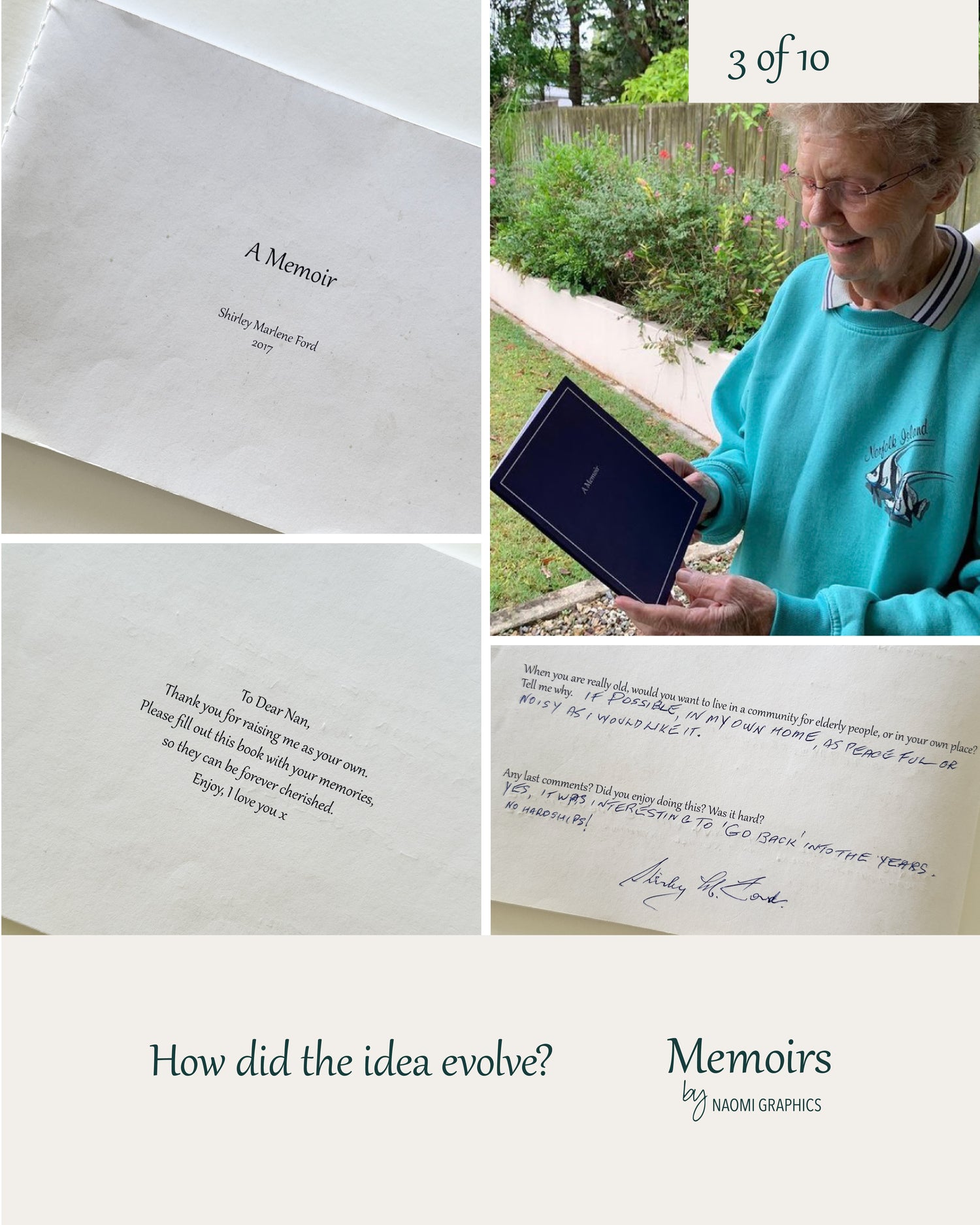 However some questions my Nan stalled on or said, “Save that for another day.” So I started to compile these questions and eventually had enough to put into a book. The sewn book cost me $50 to print 2 copies without a cover. Nan fully filled it out, proudly. My favourite part was that she signed the back of it (I then added an autograph part into future versions) and wanted to “Talk about this book more.”